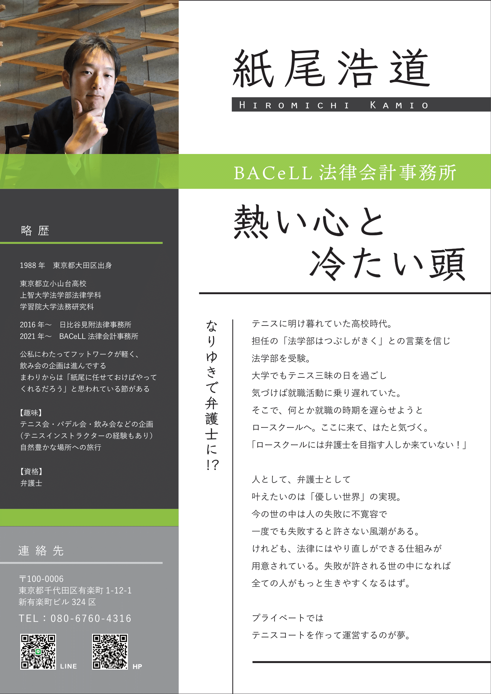 重厚な専門性と幅広いネットワークを活かし、従来の枠にとらわれない新しいリーガルサービスを目指しているBACeLL 法律会計事務所の紙尾浩道様より、オンラインA4名刺の作成をご依頼いただきました。