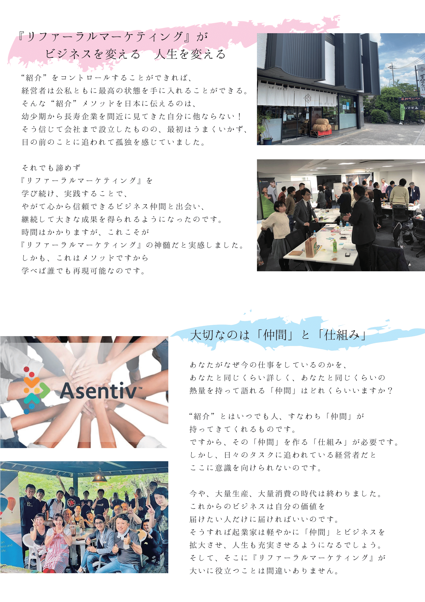 本物のリファーラルマーケティングを企業・経営者に届ける株式会社 Asentive Japanの池田亜由美様よりオンラインA4名刺の作成をご依頼いただきました。