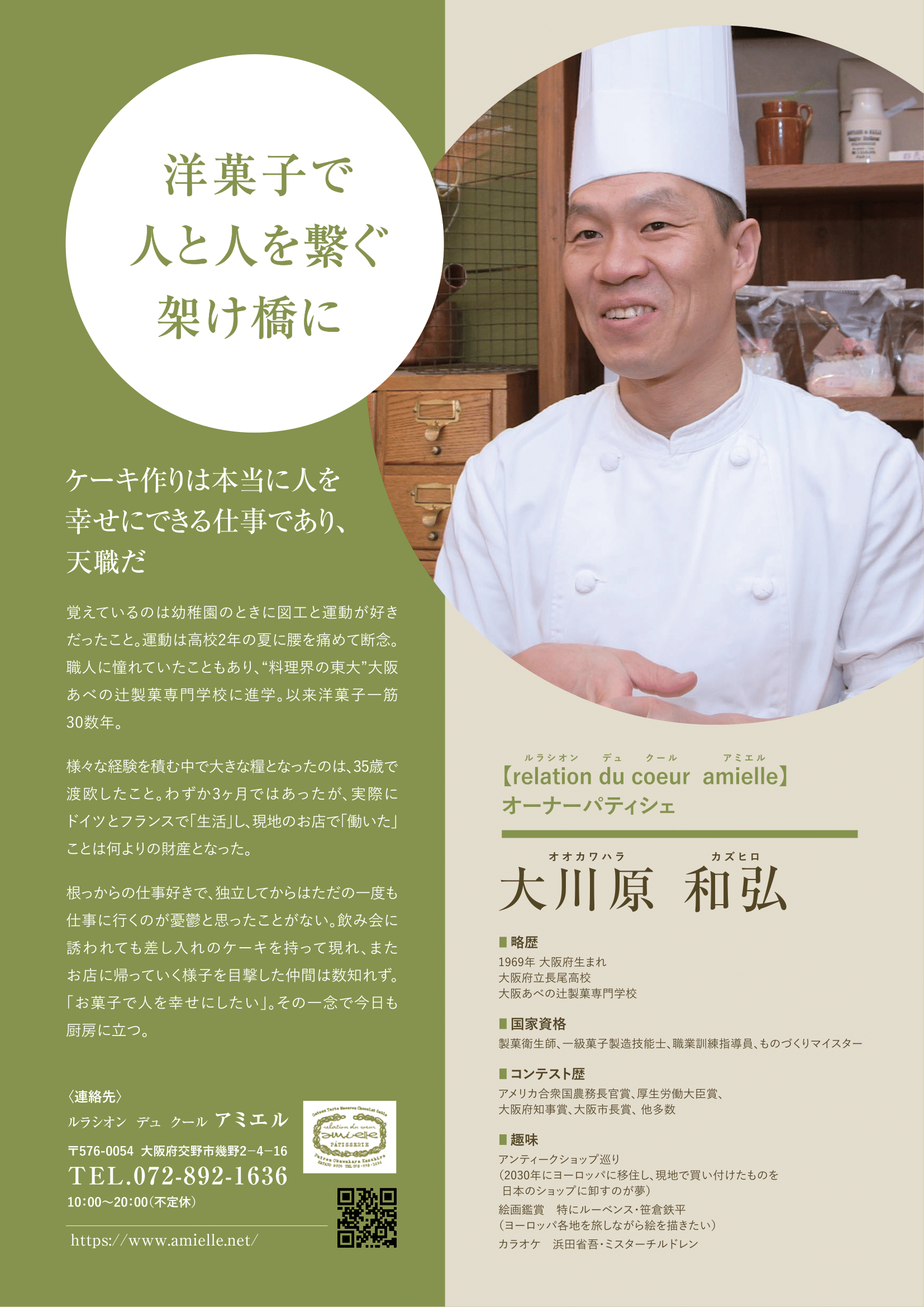 大阪府交野市で、洋菓子店を経営し、パティシエとして活躍されている大川原和弘様よりオンラインA4名刺の作成をご依頼いただきました。