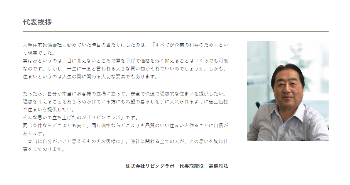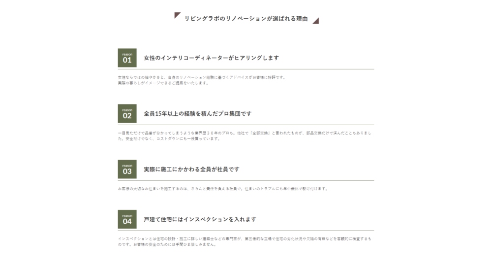 適正価格×オーダーメイドで叶えるリノベーション・リフォームを行っている株式会社リビングラボ様よりホームページ向けのライティングをご依頼いただき「選ばれる理由」と「代表挨拶」を制作しました。