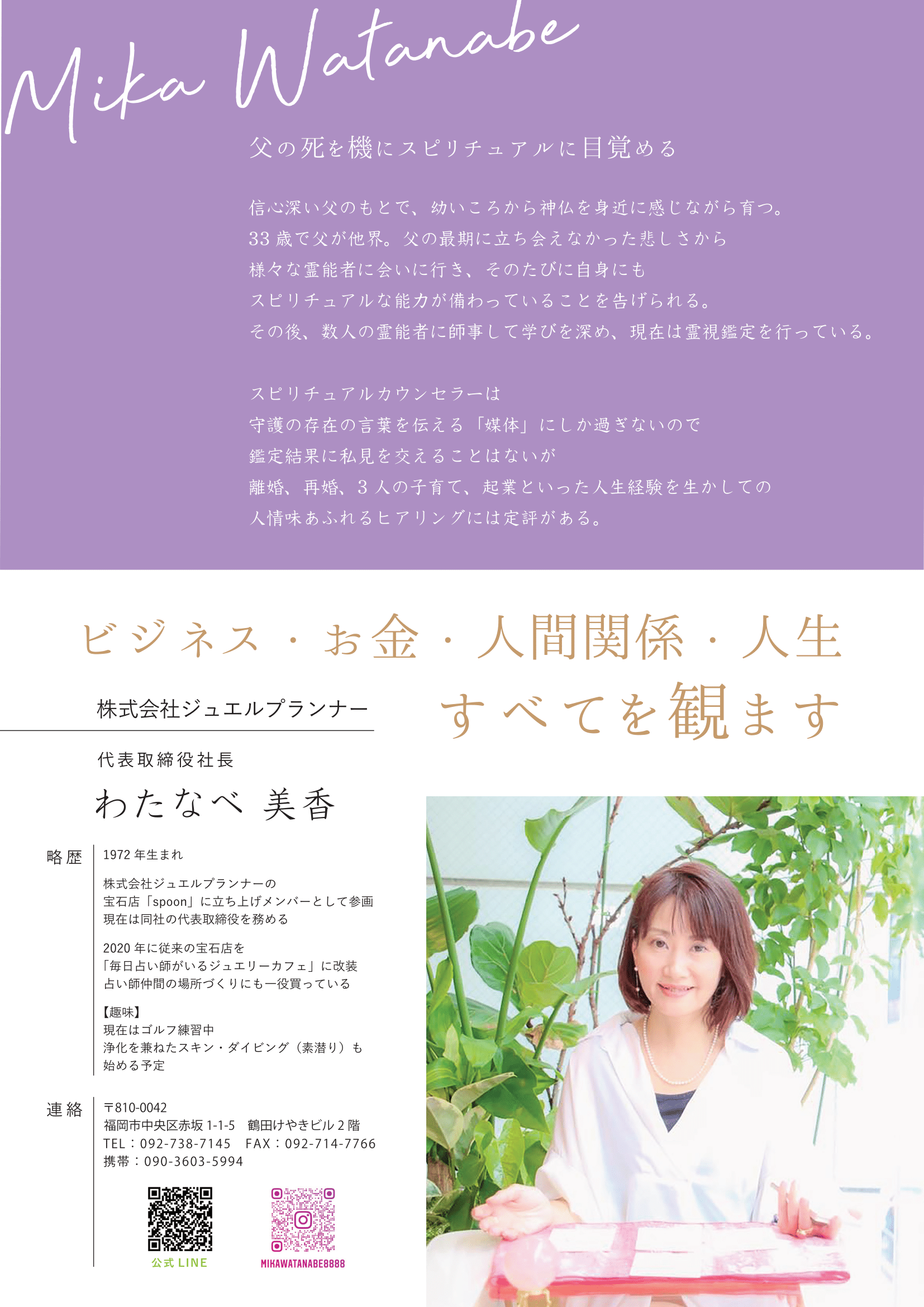 福岡市中央区赤坂の宝石店「spoon」を経営される、スピリチュアルカウンセラーのわたなべ美香様よりオンラインA4名刺の作成をご依頼いただきました。