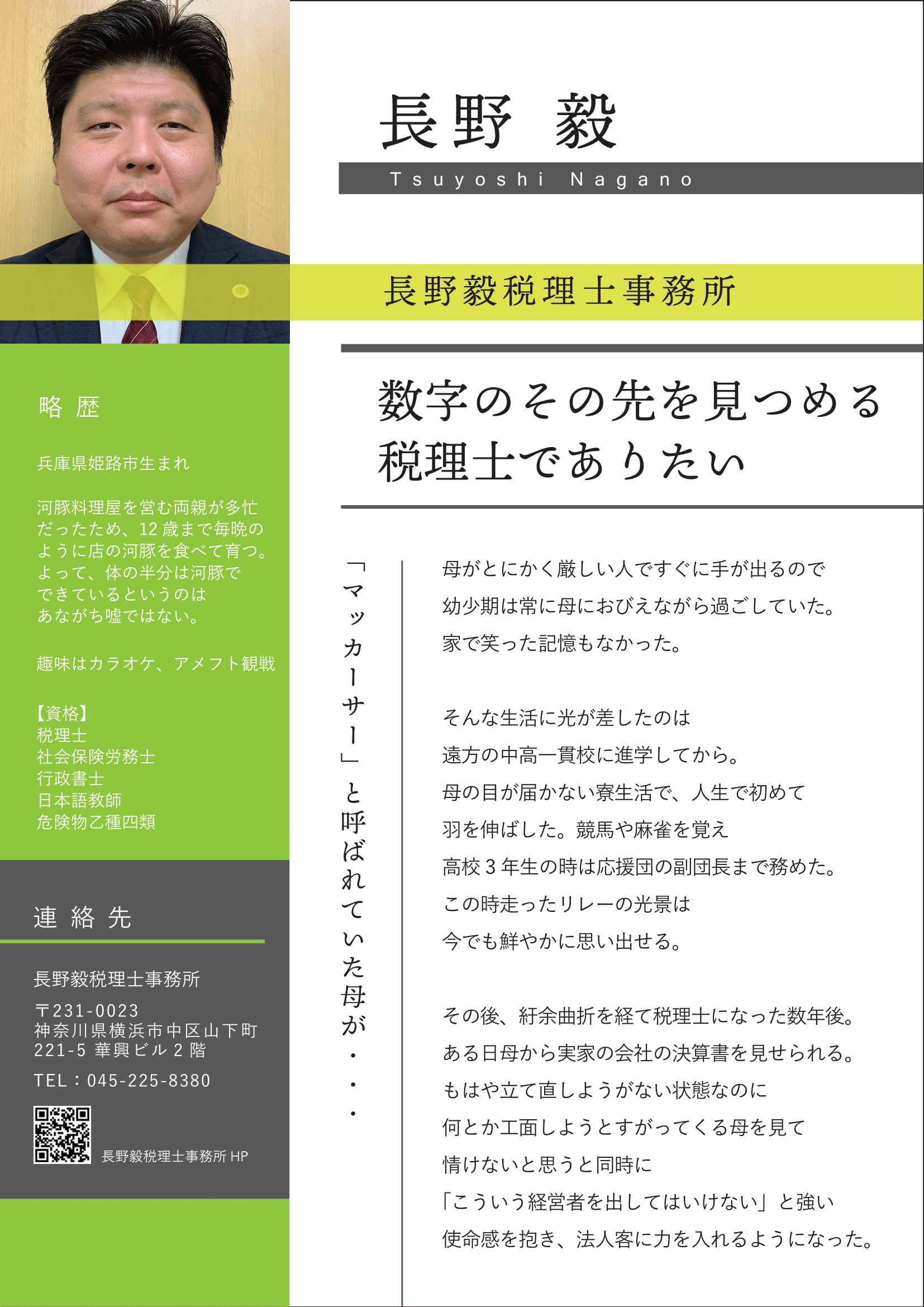 横浜市で税理士業務、社会保険労務士業務、行政書士業務の3つをワンストップで提供されている長野毅税理士事務所の長野毅様より、オンラインA4名刺の作成をご依頼いただきました。