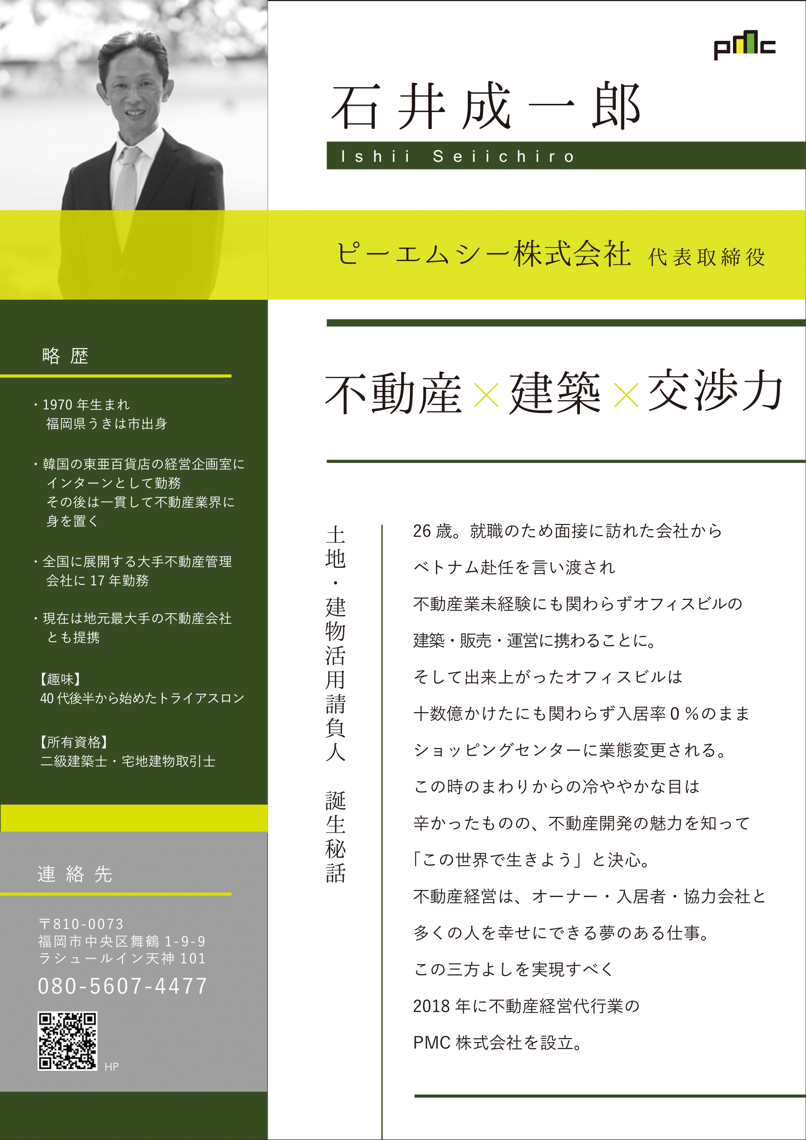 土地オーナー様の信頼できるパートナーとして有効な土地建物活用を提案されているピーエムシー株式会社代表の石井成一郎さま。オンラインA4名刺制作のご依頼をいただきました。