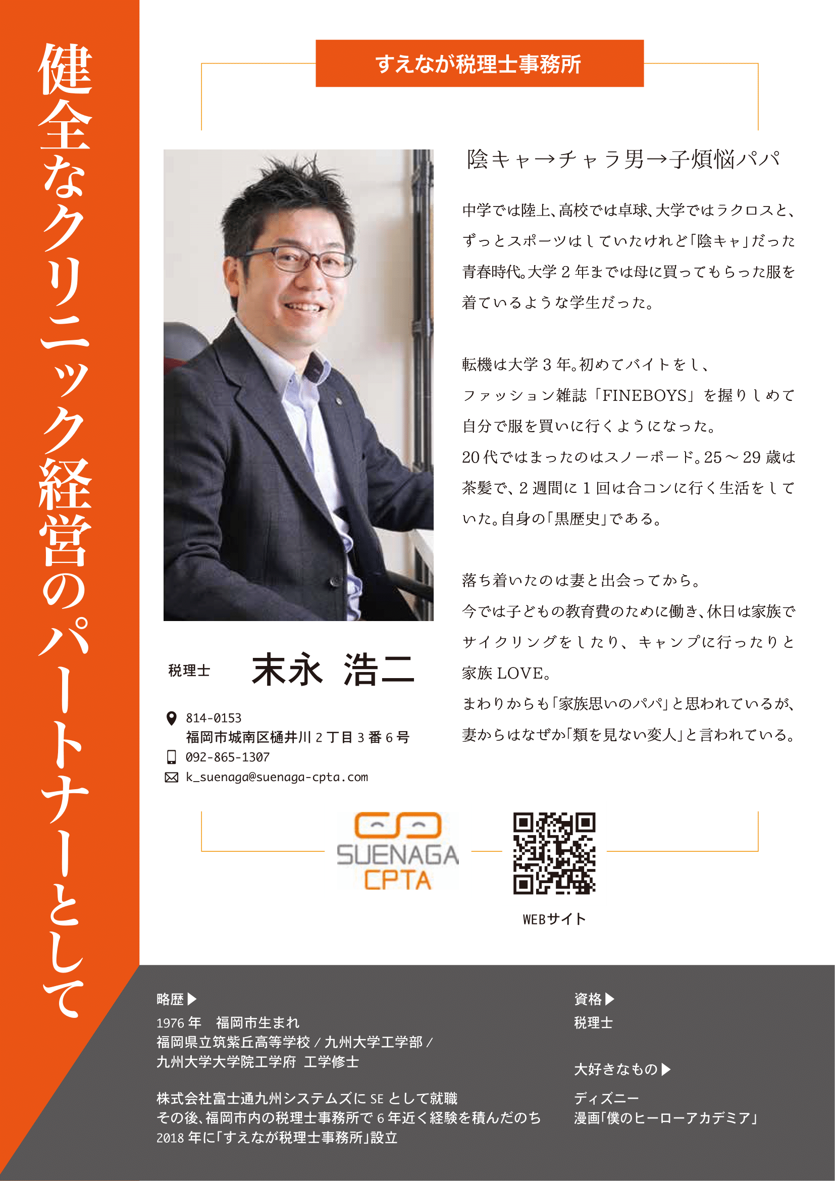 福岡を拠点に税理士としてクリニックを中心とした経営へのアドバイスを行っている末永浩二様よりオンラインA4名刺の作成をご依頼いただきました。
