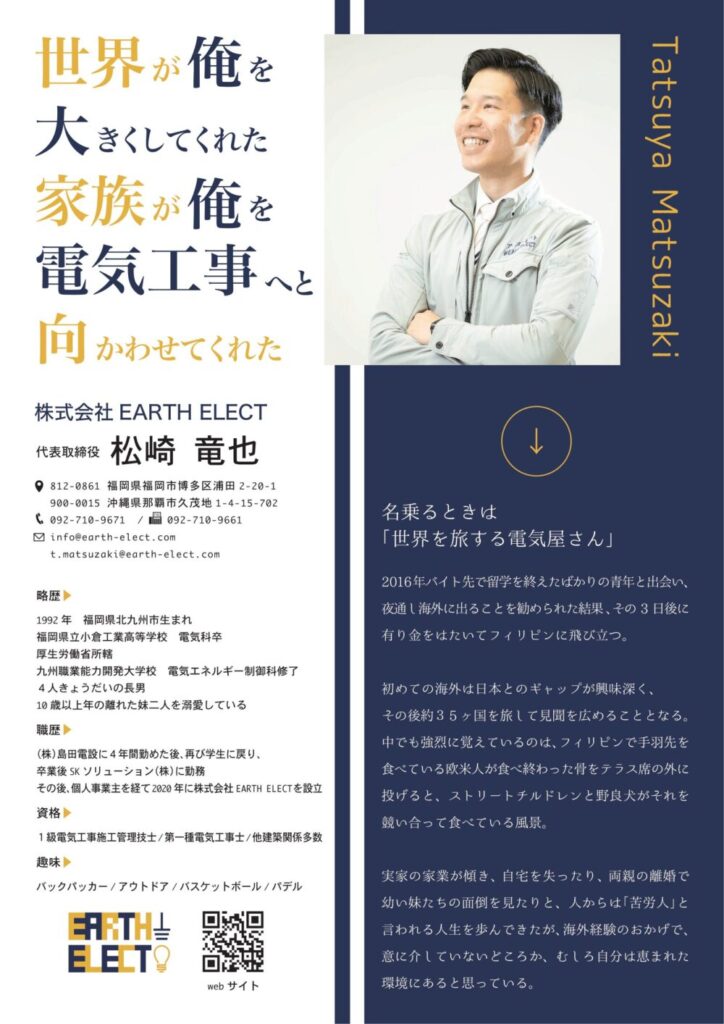 福岡を拠点に、電気工事の会社を経営する松崎竜也様よりオンラインA4名刺の作成をご依頼いただきました。