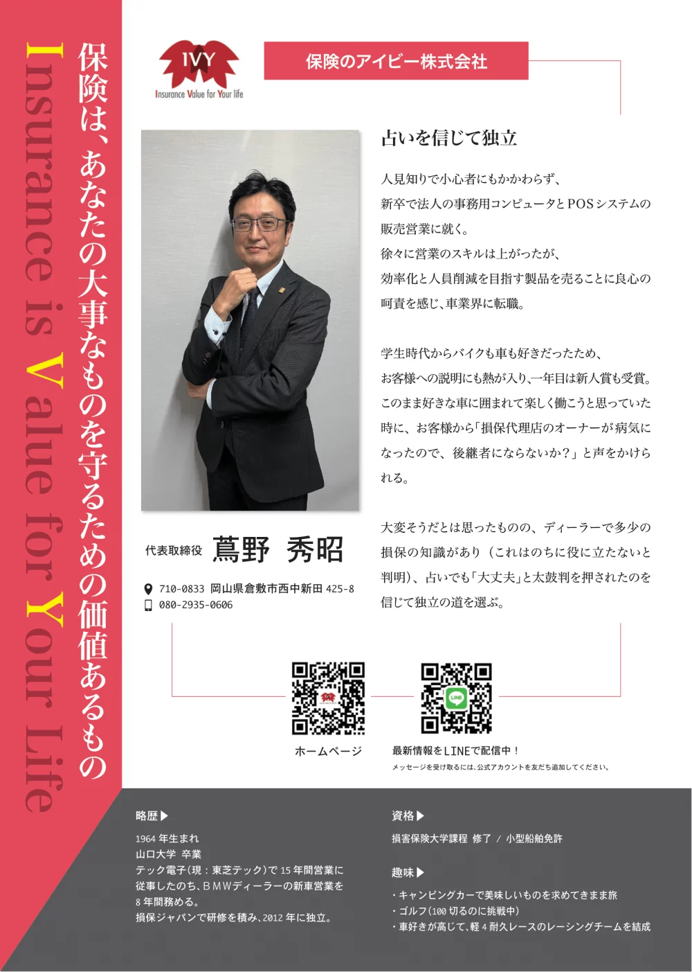 「保険は、あなたの大事なものを守る」をモットーに損保代理店として顧客をサポートしている蔦野秀昭様よりオンラインA4名刺の作成をご依頼いただきました。